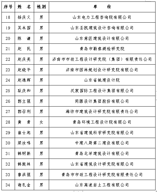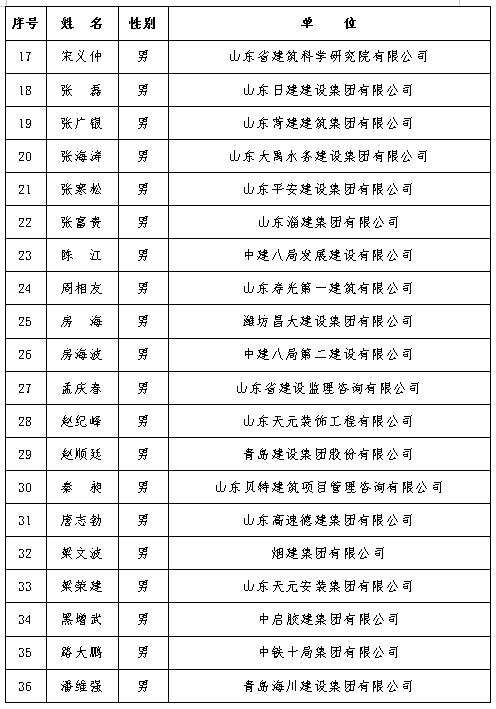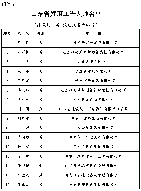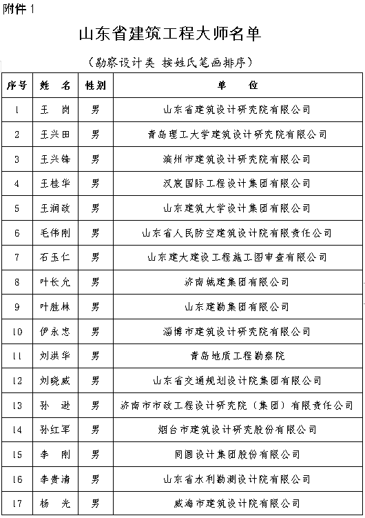 日前,山东省住房和城乡建设厅公布了我省首批70名建筑工程大师名单。授予王岗等34名同志山东省建筑工程大师称号(勘察设计类),授予于科等36名同志山东省建筑工程大师称号(建筑施工类)。