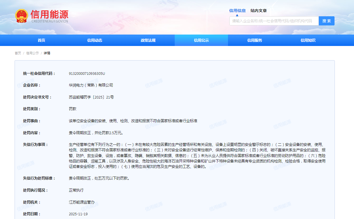 苏监能稽罚字〔2025〕21号内容显示,华润电力(常熟)有限公司的被处罚事由为:该单位安全设备的安装、使用、检测、改造和报废不符合国家标准或者行业标准。对此,江苏能源监管办责令其限期改正,并处罚款2.5万元。处罚执行情况:正常执行。