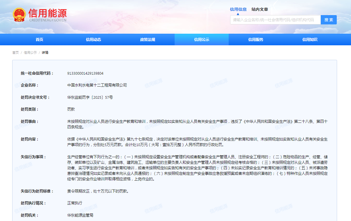 华东监能罚字〔2025〕57号内容显示,中国水电十二局的被处罚事由为:未按照规定对从业人员进行安全生产教育和培训,未按照规定如实告知从业人员有关安全生产事项,违反了《中华人民共和国安全生产法》第二十八条、第四十四条规定。