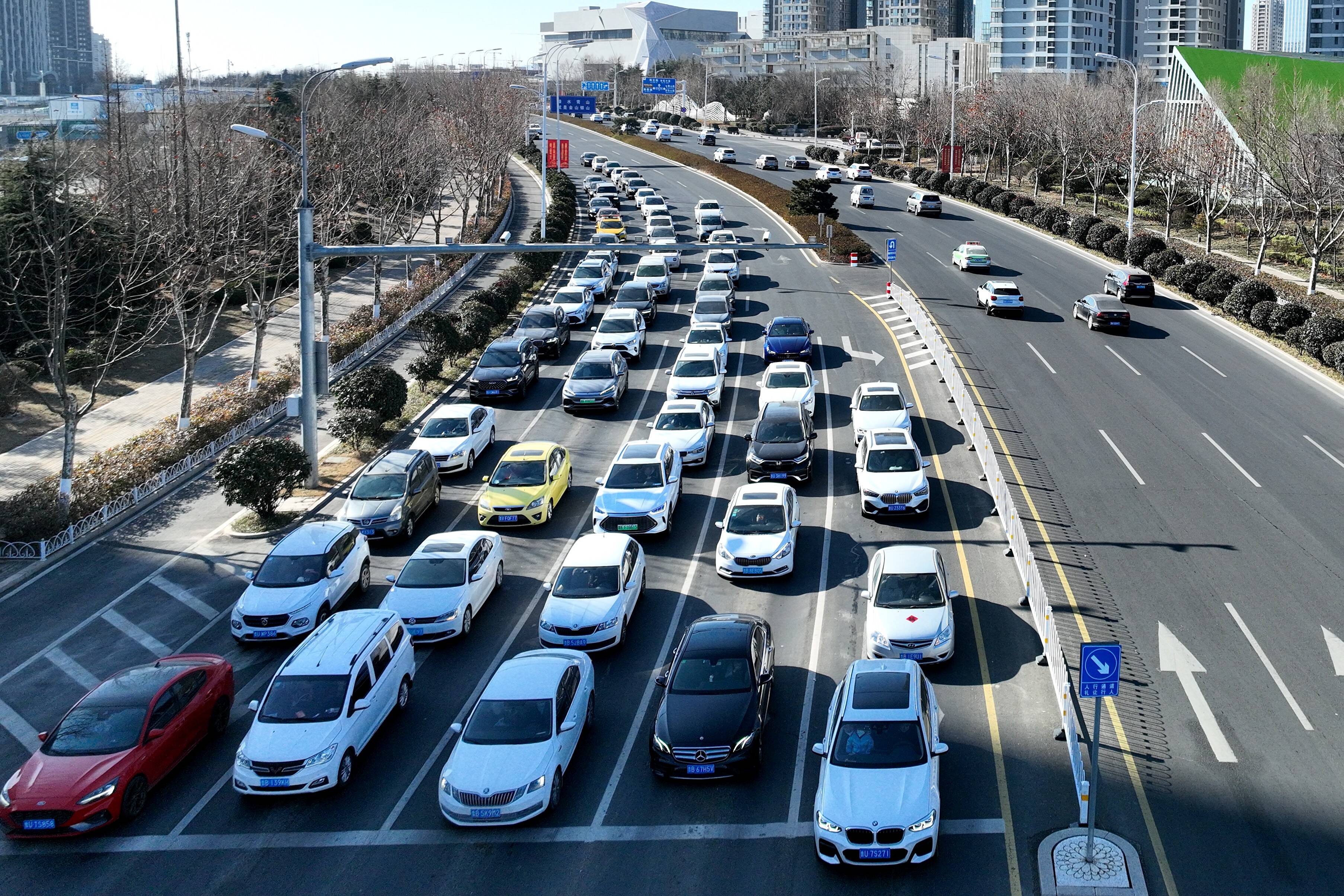 1月27日,在滨海大道与双珠路交界处,返程车辆明显增多(无人机照片)。当日是春节假期最后一天,人们陆续返程,新区迎来返程客流高峰。