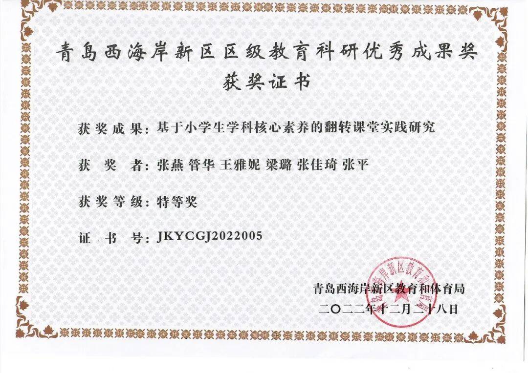 近日,青岛西海岸新区教育和体育局办公室公布《关于公布2022年区级教育科研优秀成果奖的通知》,青岛西海岸新区珠江路小学报送的《基于小学生学科核心素养的翻转课堂实践研究》喜获特等奖!据悉,经单位申报、初评推荐、市级复评,该教育科研成果同时荣获青岛市教育科研成果二等奖的好成绩。