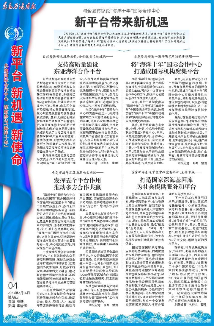 2月15日,在“海洋十年”国际合作中心共建协议签署暨揭牌仪式上,“海洋十年”国际合作中心正式落户西海岸新区,这为青岛发挥海洋科研优势、扩大海洋领域对外开放交流、推动海洋经济高质量发展提供了新的机遇。“海洋十年”国际合作中心运营后,具体会发挥什么样的作用?又该如何用好这个平台?部分与会嘉宾接受了本报记者采访。