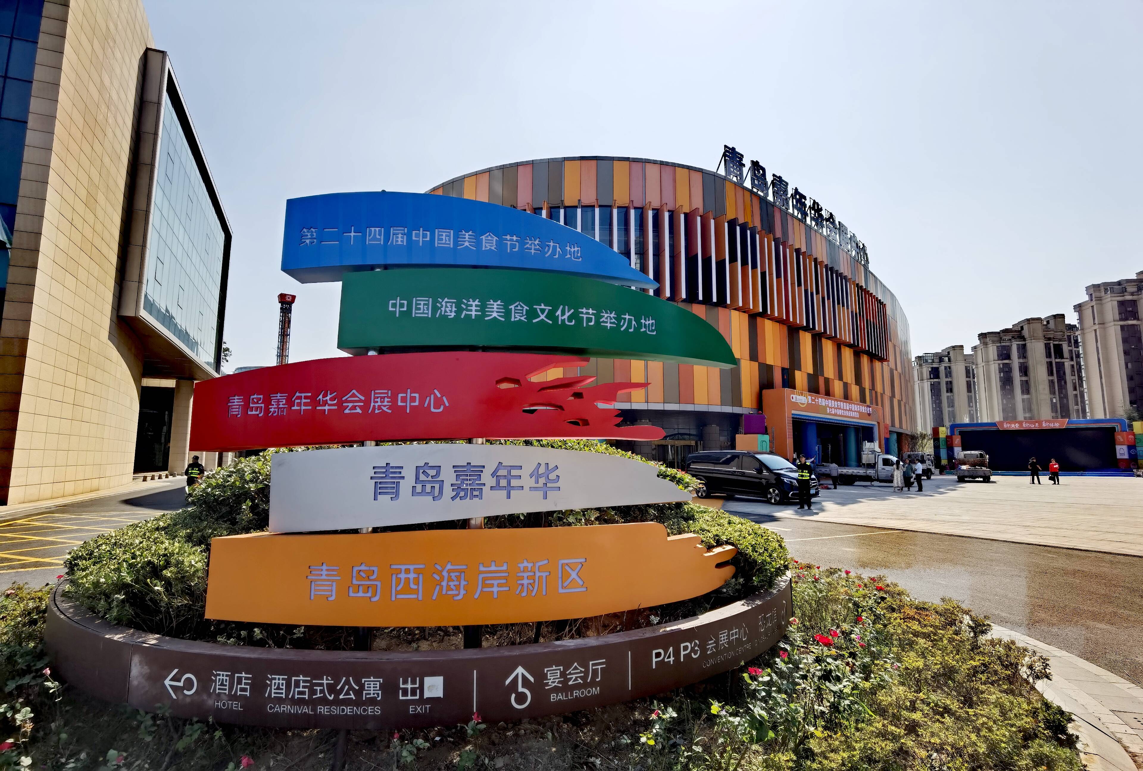 嘉年华会展中心面朝大海,整体造型为一块抽象的海边岩石,与唐岛湾滨海风情交相辉映。这里是本届美食节的举办地,将于开幕当天正式启用。目前,布展工作正在进行最后的收尾。