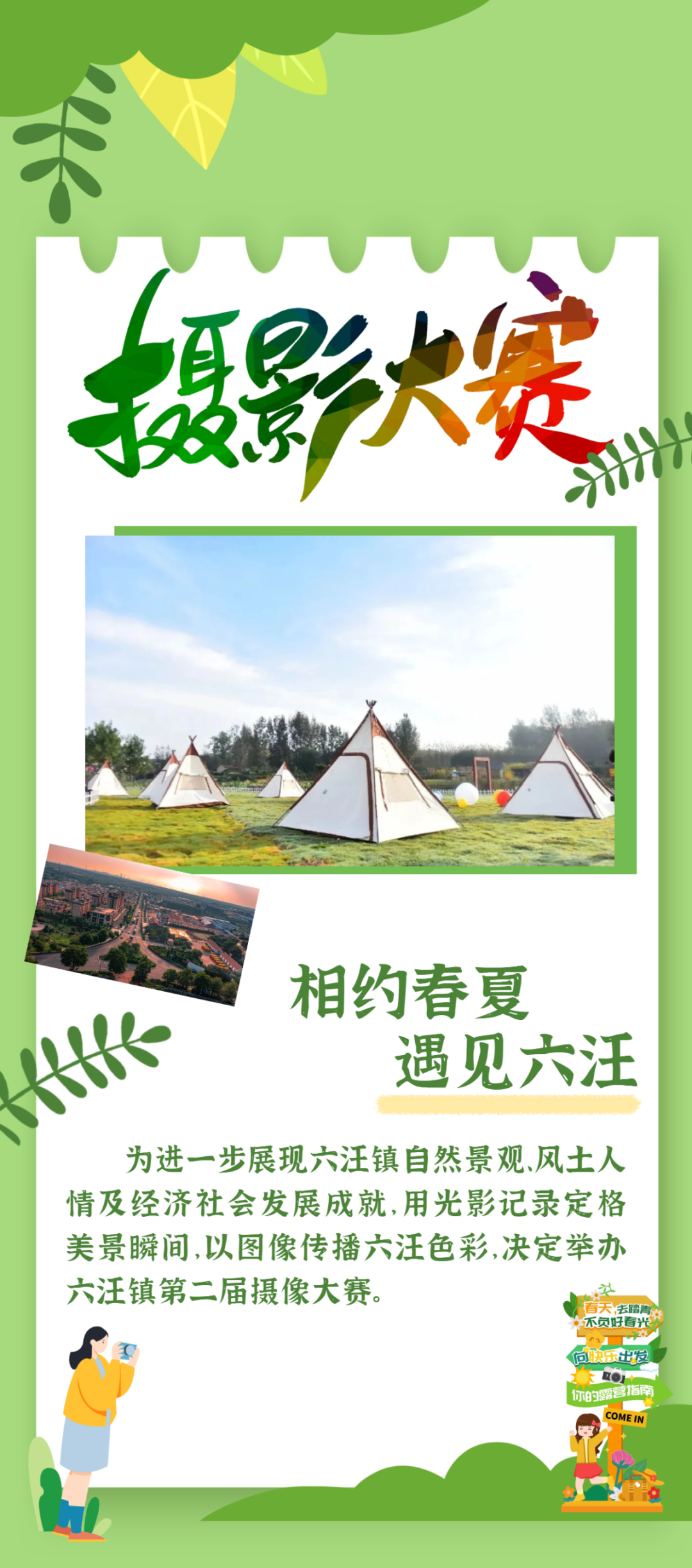 相约春夏 遇见六汪 主办单位 青岛西海岸新区六汪镇人民政府 协办单位 青岛西海岸新区广播电视台FM92.6 青岛胶河上上农业有限公司 大赛时间 投稿时间:2024年5月1日—2024年6月30日 评选时间:2024年7月2日—2024年7月10日 本次比赛分为集体采风和自由摄影两种形式。 集体采风:拟定5月中下旬,由大赛主办方、FM92.6邀请社会各界摄影爱好者等组成采风团,统一乘车,分别到六汪镇驻地、青岛祝兹田园综合体、铁橛山风景区和青岛上上农业有限公司等地开展集体采风活动。 自由摄影:广大摄影爱好者可自由到六汪采风摄影,按照“投稿须知”要求,在规定时间内创作投稿。 为保证摄影作品评选工作公平公正,本次大赛采取初选、终选和网络评选及专家评审相结合的方式。 1.初选:作品征稿后会首先进行初选流程,选出贴合本次活动主题、质量较好的摄影作品进入终选。 2.终选采用网络投票和专家评选相结合的方式。“锦绣六汪”微信公众号开通投票通道,展示参赛作品,接收网友投票;评选阶段由专家对参赛作品进行评审;分别按照50%的比重,综合计算投票分值和评审分值,评选出获奖作品。 (一)作品规格 1.图片类报送要求:彩色、黑白、单幅、组照不限(组照作品限4-8幅),作品允许对色调、反差等效果做调整,但不得改变作品原状,每幅作品规格大小不低于5MB。 短视频类报送要求:参赛作品视频时长严格控制在1.5分钟之内,大小不超过500M,MP4格式,建议1080*1920竖屏,1080p分辨率,要求画面流畅稳定,音效清晰,无明显噪音,字幕与画面和谐。 (二)投稿要求 1.本次大赛作品要反映六汪人文风光、乡村振兴、产业发展、新农村建设等方面,风格、题材不限,欢迎贴近生活、视角独到、具有感染力的作品。 2.作品需为原创,内容独立完整、明确,著作权无争议,内容健康及符合主题,涉及有关肖像权、著作权等法律责任由作者自负。参与大赛的作品不可进行过度的后期处理,保证照片的真实性,且不得含有任何水印。 3.作品应为在六汪镇境内创作,且为2024年新拍摄作品(拍摄器材不限),参赛作品文件名包含:作品名称+拍摄地点(作品简介)+作者姓名+联系方式等。 4.参赛作品分为图片和短视频两类,作品均以电子稿形式参赛,分别独立评选。 5.本次大赛不收取任何费用。主办方有权在出版画册、举办展览、相关宣传中使用投稿作品,不再支付稿酬。 6.大赛评选结束后,将及时在“锦绣六汪”公众号公布评选出的获奖作品及作品信息。 投稿邮箱:xhalwzxcb@163.com 咨询电话:82152989 照片类和短视频类分别评选出一、二、三等奖和优秀奖,颁发获奖证书和奖金。 一等奖各1名,奖金各2000元; 二等奖各3名,奖金各1000元; 三等奖各5名,奖金各500元; 优秀奖根据投稿实际情况确定名单,奖金各300元。 ★ 注:各奖项设置名额为暂定,具体名额根据投稿数量及质量适当调整;主办方将根据获奖作品情况择机组织颁奖仪式和作品展览。 ★ 主办方拥有对此征稿启事的最终解释权。 树绕村庄,水满陂塘 倚东风、豪兴徜徉 小园几许,收尽春光 有桃花红,樱花白,菜花黄 登长城,攀铁橛,看悬泉,赏春花 六汪光影,值得期待