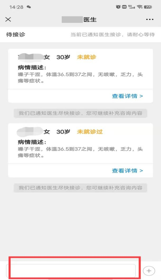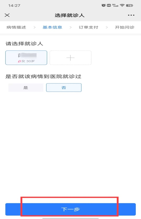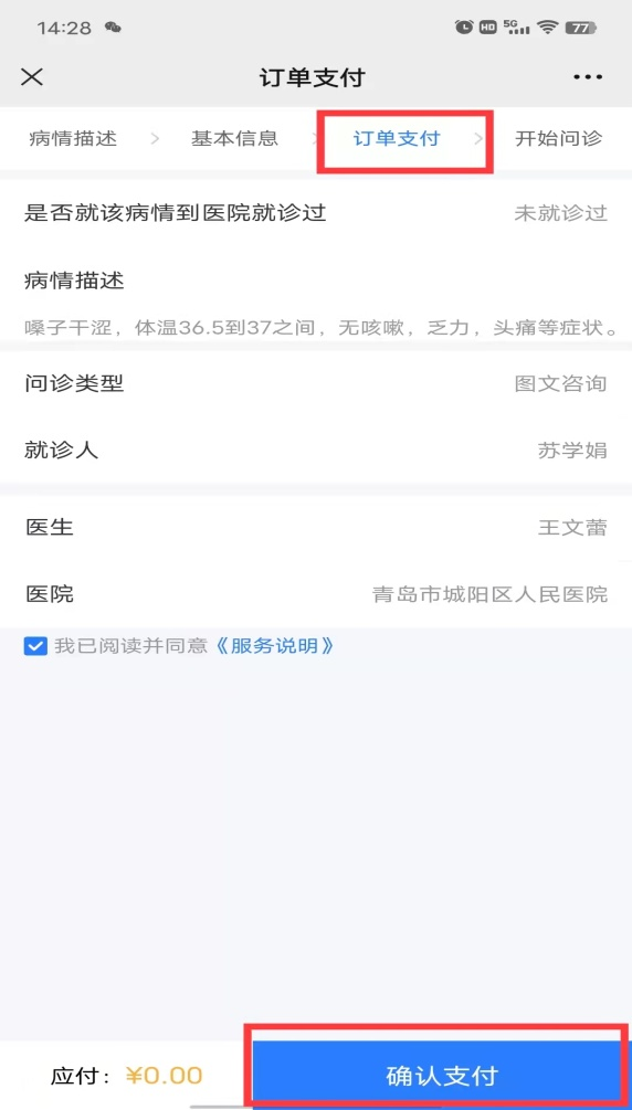 3、真实填写个人相关信息,点击【下一步】直至【订单支付】中的【确认支付】后,进入咨询界面,与医生进行交流。