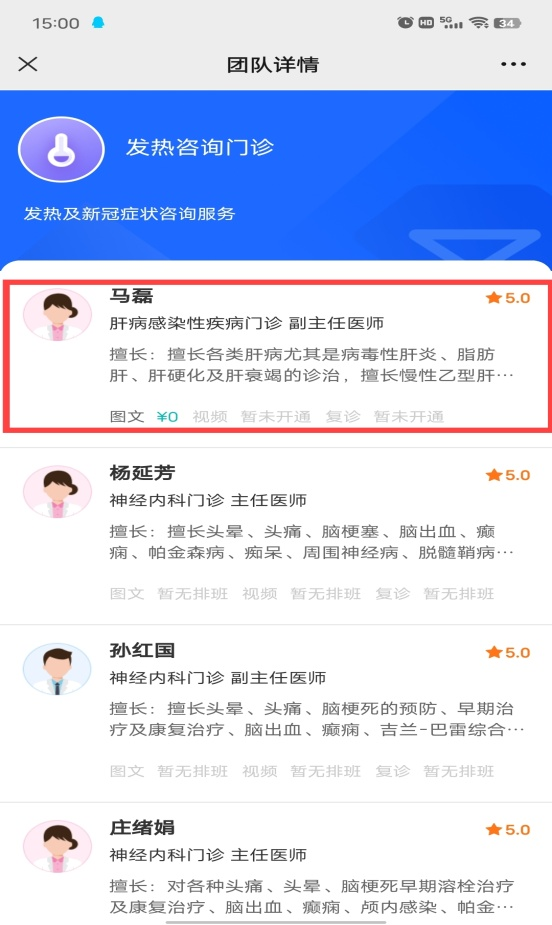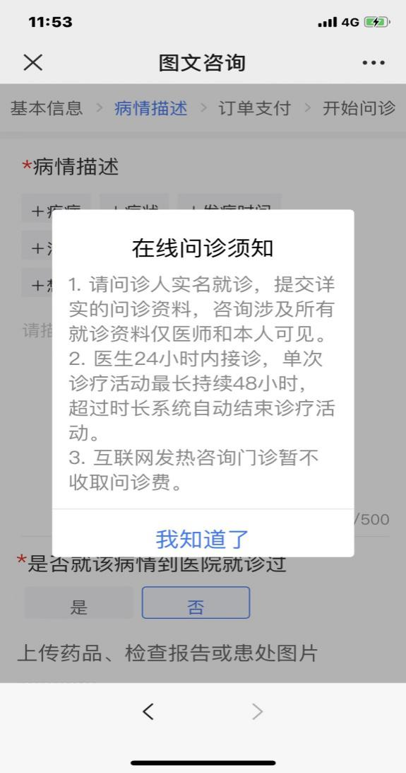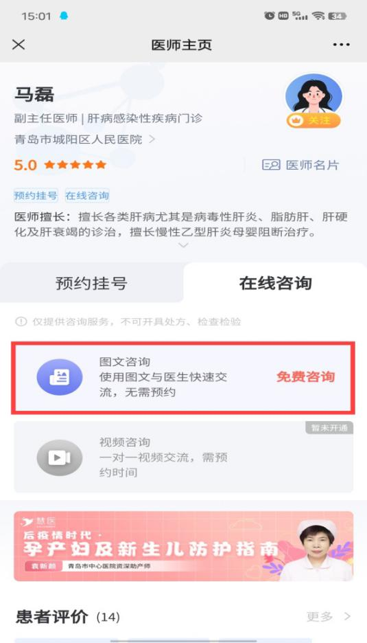 2、在坐诊医生列表中选中医生,点击【在线咨询】-【图文咨询】中点击【免费咨询】进行问诊。