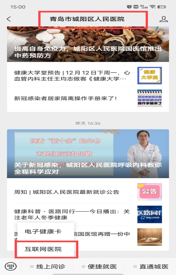 1、关注“青岛市城阳区人民医院”公众号,点击【线上问诊】—【互联网医院】进入互联网医院,点击【发热咨询】进行问诊。