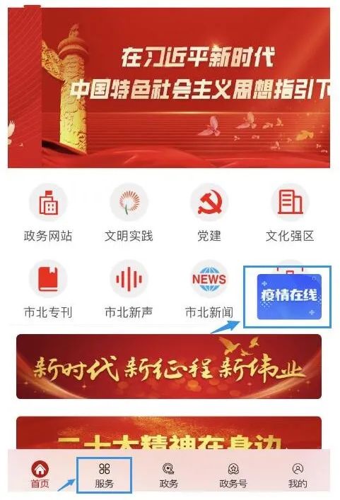 1.打开“爱市北”App,首页最下方点击“服务”板块。(如图)