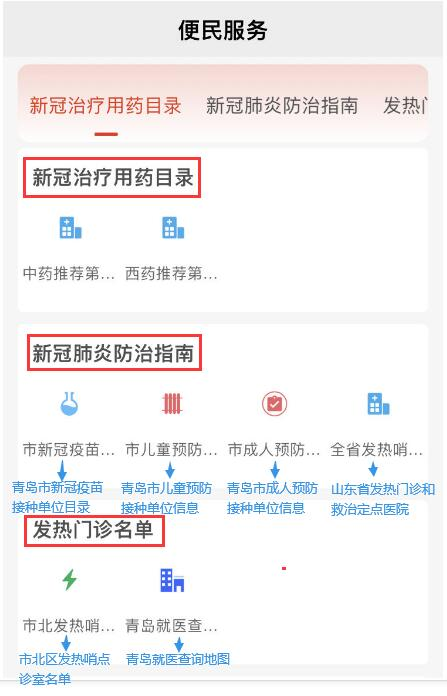 可查询新冠肺炎防治相关官方信息,如:市北区发热门诊地图及电话、青岛市就医查询地图、青岛市预防接种门诊目录、国家中药推荐目录、国家西药推荐目录、用药指南等,并陆续补充最新权威消息。
