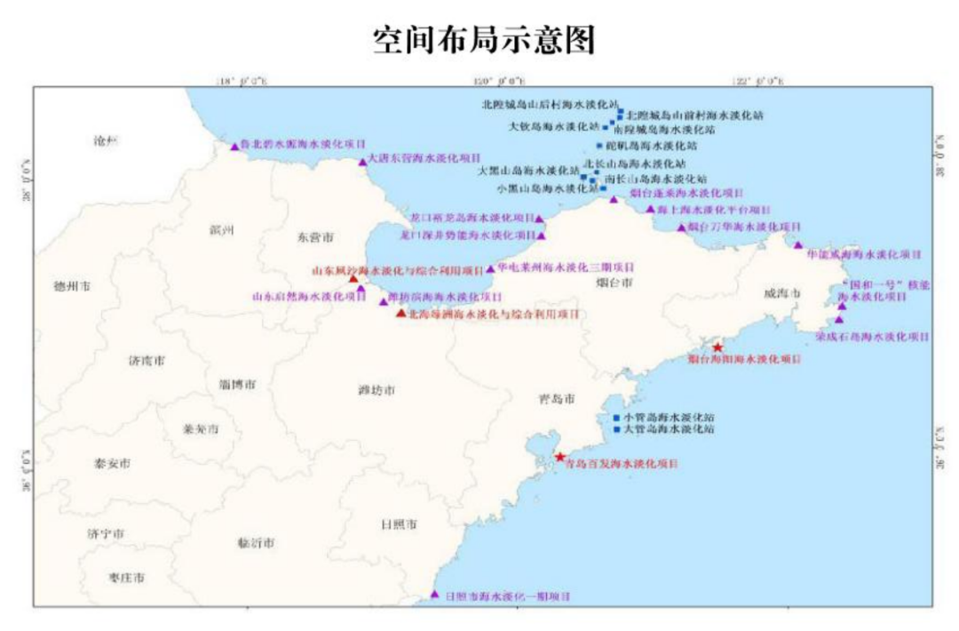 2017年,《山东省水安全保障总体规划》提出:“综合考虑海岛、沿海工业园区以及沿海城市水资源现状及用水需求,合理规划海水淡化工程选址布局,优先解决淡水资源紧缺地区的用水需求”。