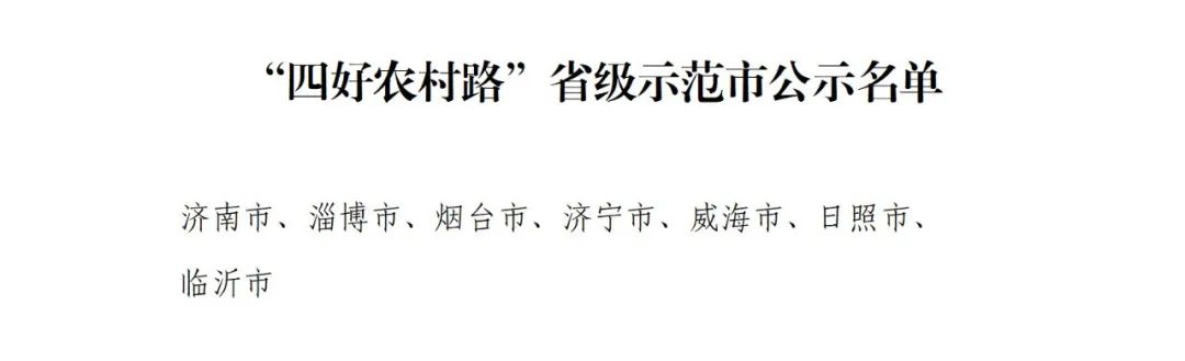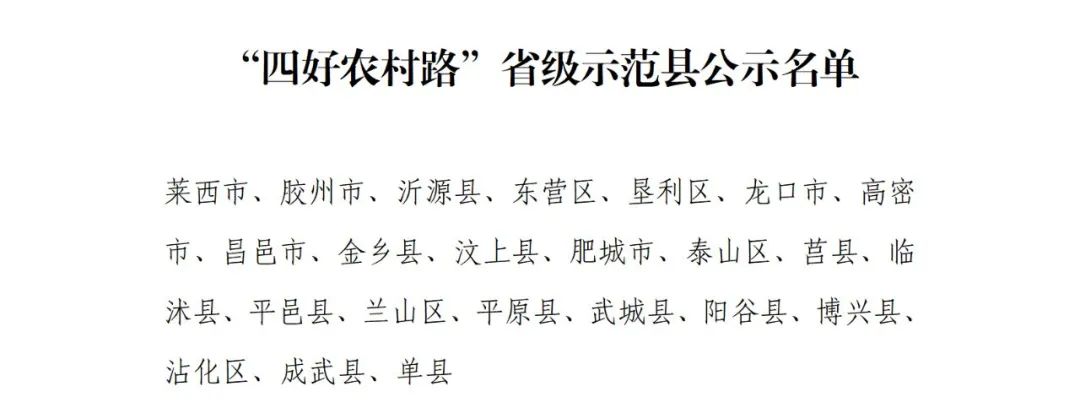 经市(县)级申请、省级核查和专家评审等程序,拟将济南市等7个市级单位命名为“四好农村路”省级示范市,将莱西市等23个县级单位命名为“四好农村路”省级示范县,具体名单见附件。现予公示,公示期限为2023年2月13日-2月17日。