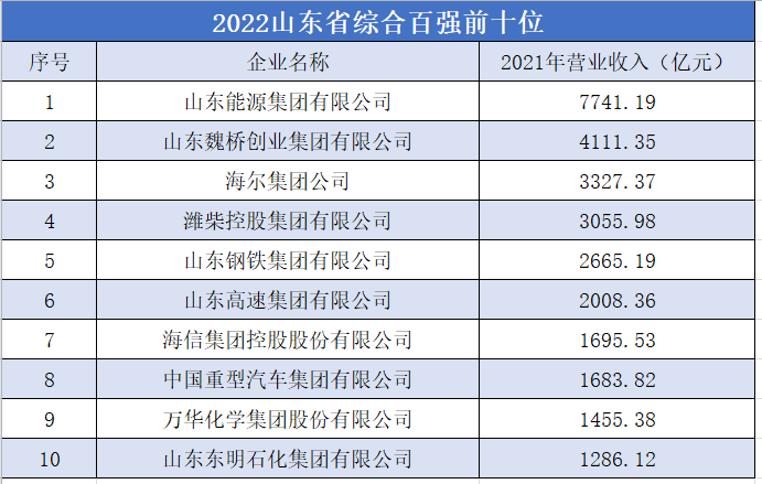 为更好发挥大企业的领航作用,引导更多企业做大做强做优,依据企业2021年营业收入年报数据,经企业自愿申报,省企业联合会组织审核,确定并公布了2022山东企业综合百强和工业企业百强名单。
