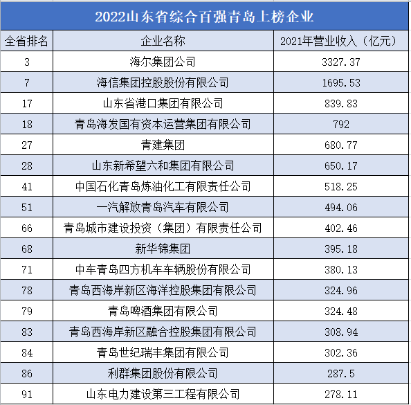 作为山东经济发展的龙头,青岛企业在这个榜单上一直有着不错的表现。今年,青岛一共有17家企业上榜,全省占比超过六分之一,上榜企业2021年营收总额突破万亿,达到12002亿元,较上年大幅增长31%,表现出较好的成长性。