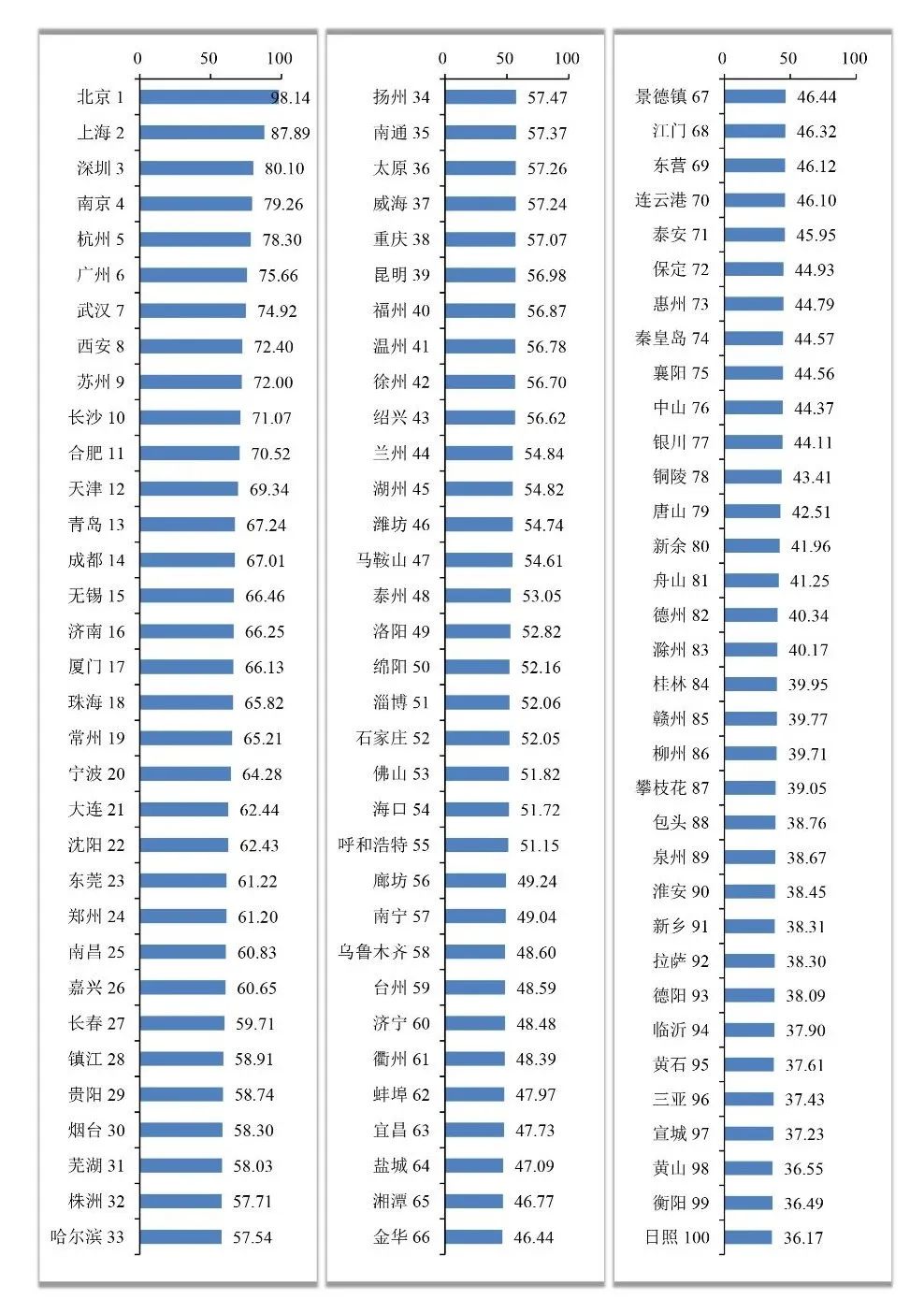 值得注意的是,百强榜城市地区生产总值之和超68万亿元(占全国的67%),北京和上海超3万亿元。百强榜城市全社会研发经费投入之和超过2万亿元(占全国的86%),其中,北京超2000亿元,深圳和上海超1000亿元。