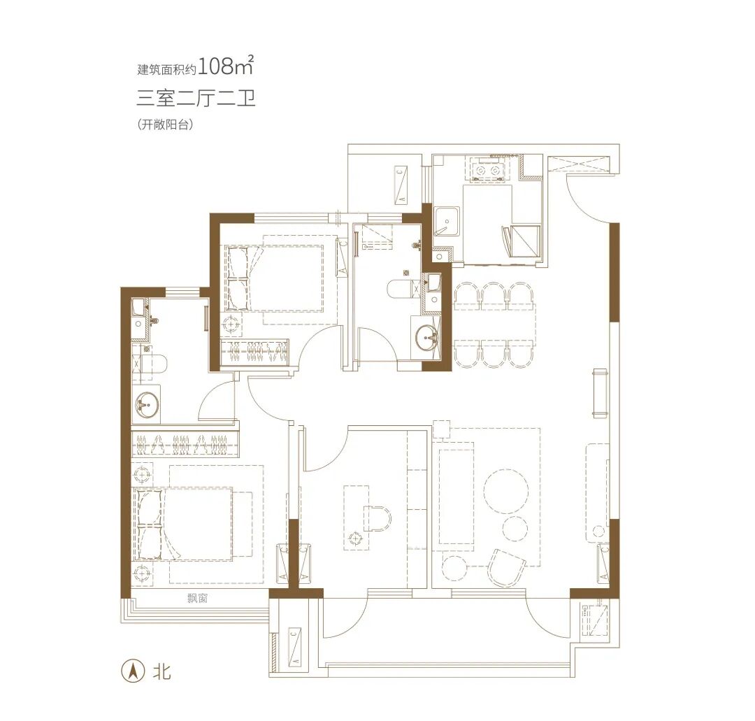 约7m开敞式双联阳台设计,约10.8m三南向开间,瞰景视野开阔;主卧套房布局,独立卫浴设计,270°观景飘窗,为生活布置更多惬意空间。