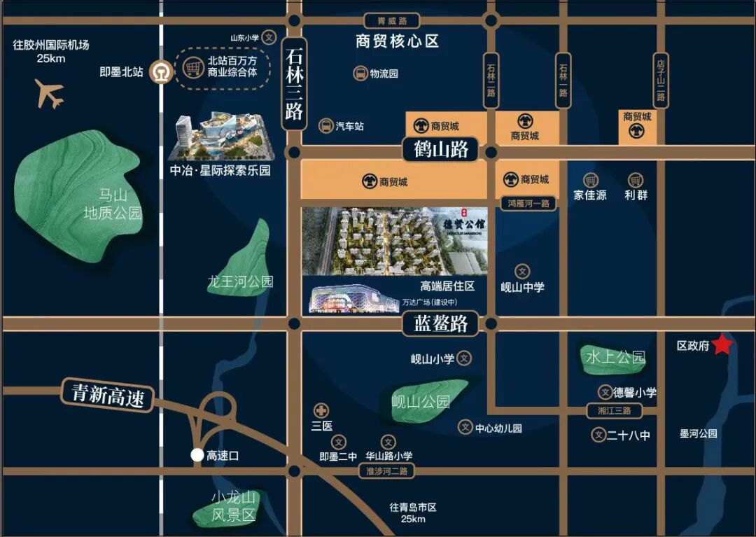 紧邻即墨西高速口、即墨北高铁站,石林三路、鹤山路、蓝鳌路等城市主干道,内达外通,极速出行。