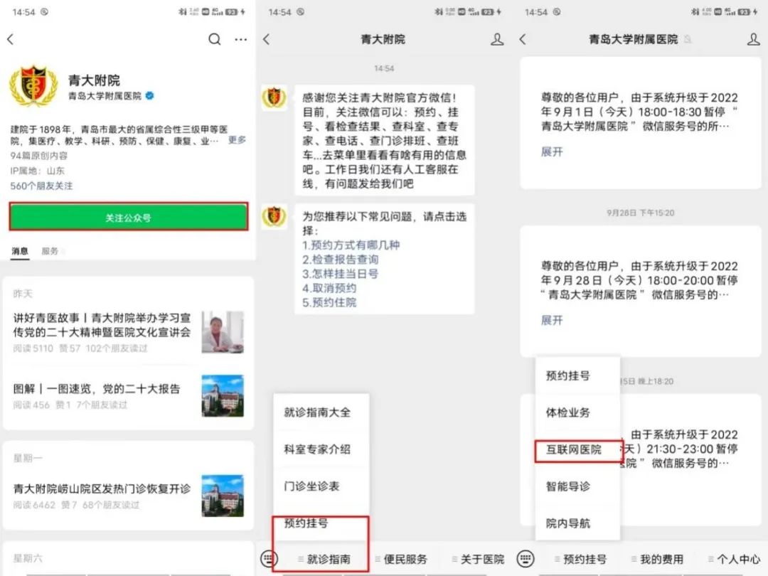 方法1:关注【青大附院公众号】。在公众号首页点击就诊指南-预约挂号菜单,进入青大附院互联网医院小程序。