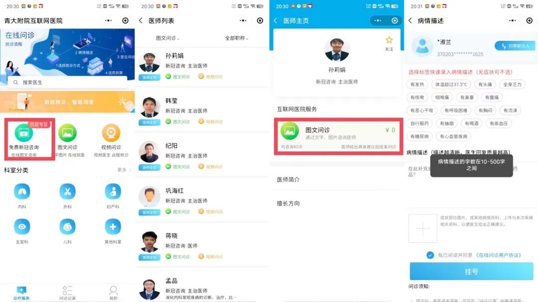 进入青大附院互联网医院,选择抗冠专区免费新冠咨询入口,选择医生,点击图文问诊,录入病情描述或问题,就可以进行免费新冠咨询啦!