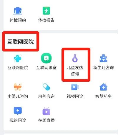 4、在互联网医院版块中点击就诊。以“儿童发热咨询”为例: