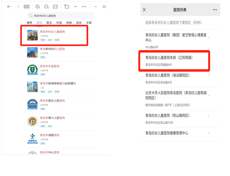 2.选择青岛妇女儿童医院——青岛妇女儿童医院本部(辽阳西路)。(同互联网医院门诊就诊攻略)