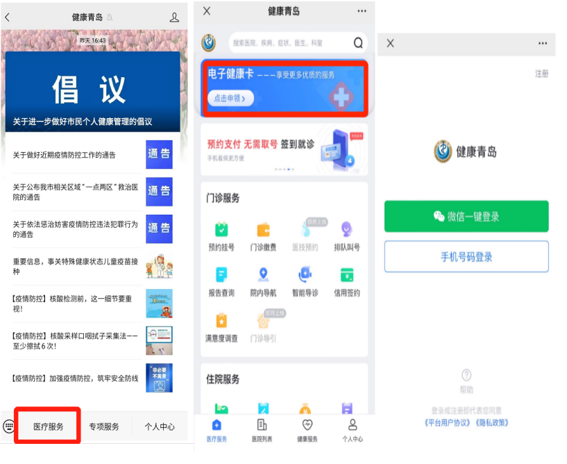 2、以“健康青岛”微信公众号为例,选择“医疗服务”进入页面,点击上方,申领电子健康卡,按照页面提示登录。