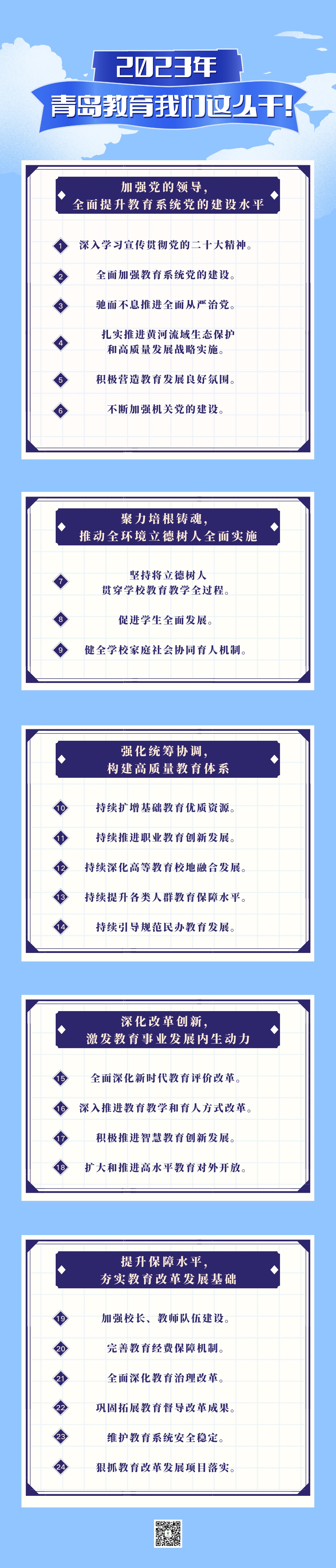 青岛新闻网1月10日讯(记者 张晓楠)1月10日,青岛市委教育工委、市教育局印发《2023年全市教育工作要点》。2023年,青岛教育将紧紧围绕深入学习贯彻党的二十大精神这条主线,深入实施黄河流域生态保护和高质量发展重大国家战略,坚持和加强党对教育工作的全面领导,全面贯彻党的教育方针,落实立德树人根本任务,深化改革,狠抓落实,加快建设高质量教育体系,全面提高人才培养质量,不断塑造发展新动能新优势,努力办好人民满意的教育,为新时代社会主义现代化国际大都市建设提供强有力的人才保证和智力支持。详细内容如下: