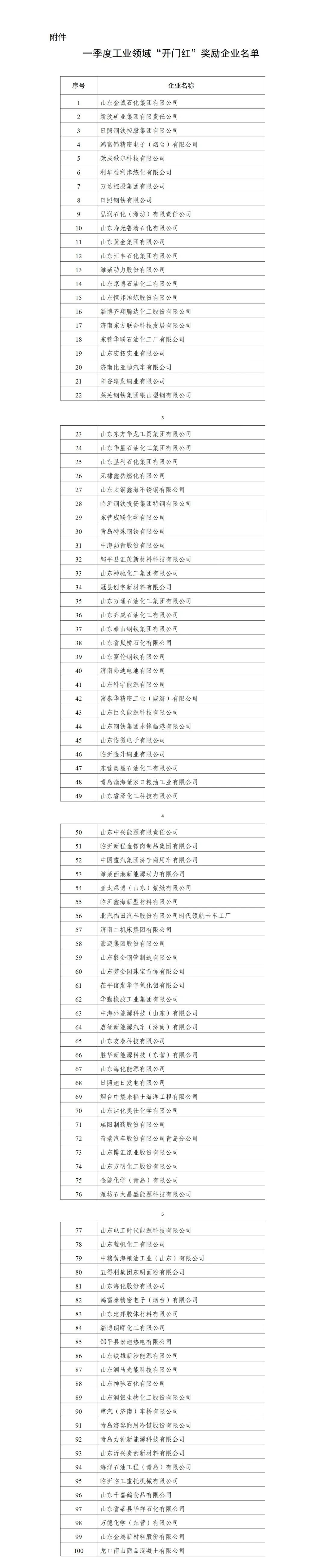 为贯彻落实省委、省政府关于加力提速工业经济高质量发展的工作部署,根据《山东省人民政府印发关于促进经济加快恢复发展的若干政策措施暨2023年“稳中向好、进中提质”政策清单(第二批)的通知》(鲁政发〔2023〕1号)有关要求,省工业和信息化厅、省财政厅联合开展了一季度工业领域“开门红”奖励评选工作,确定了奖励企业名单。经省委、省政府同意,现予以公布,对100家企业分档给予资金奖励。各市要组织获奖企业再接再厉高效生产,努力实现全年“稳进提质”,引导更多企业学习先进、提升质效,推动工业经济加力提速高质量发展。